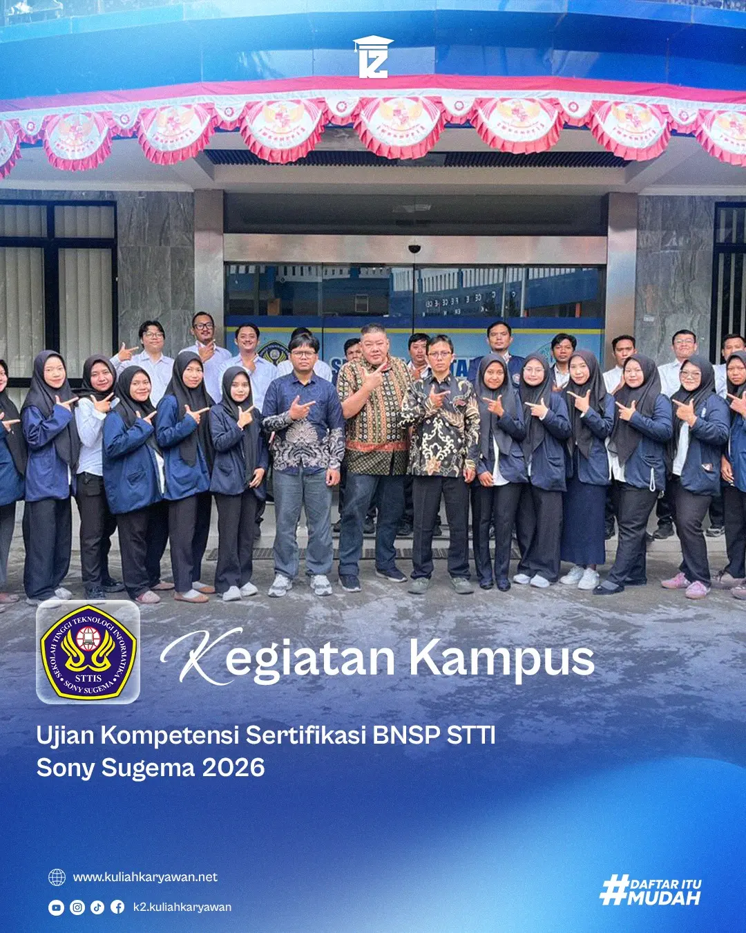 Puji syukur kita panjatkan ke hadirat Tuhan Yang Maha Esa, atas rahmat dan karunia-Nya kita dapat berkumpul dalam kesempatan yang berbahagia ini. Sekolah Tinggi Teknologi Informatika Sony Sugema senantiasa berkomitmen untuk menjadi institusi pendidikan tinggi yang unggul, inovatif, dan berdaya saing dalam menghadapi tantangan zaman. Sebagai lembaga pendidikan, tugas utama kita tidak hanya mencetak lulusan yang berkompeten dalam bidang akademik, tetapi juga membentuk karakter, integritas, serta jiwa kepemimpinan yang akan membawa perubahan positif bagi masyarakat dan bangsa. Oleh karena itu, Sekolah Tinggi Teknologi Informatika Sony Sugema terus mengembangkan sistem pendidikan yang adaptif terhadap perkembangan teknologi, dunia industri, serta dinamika global.